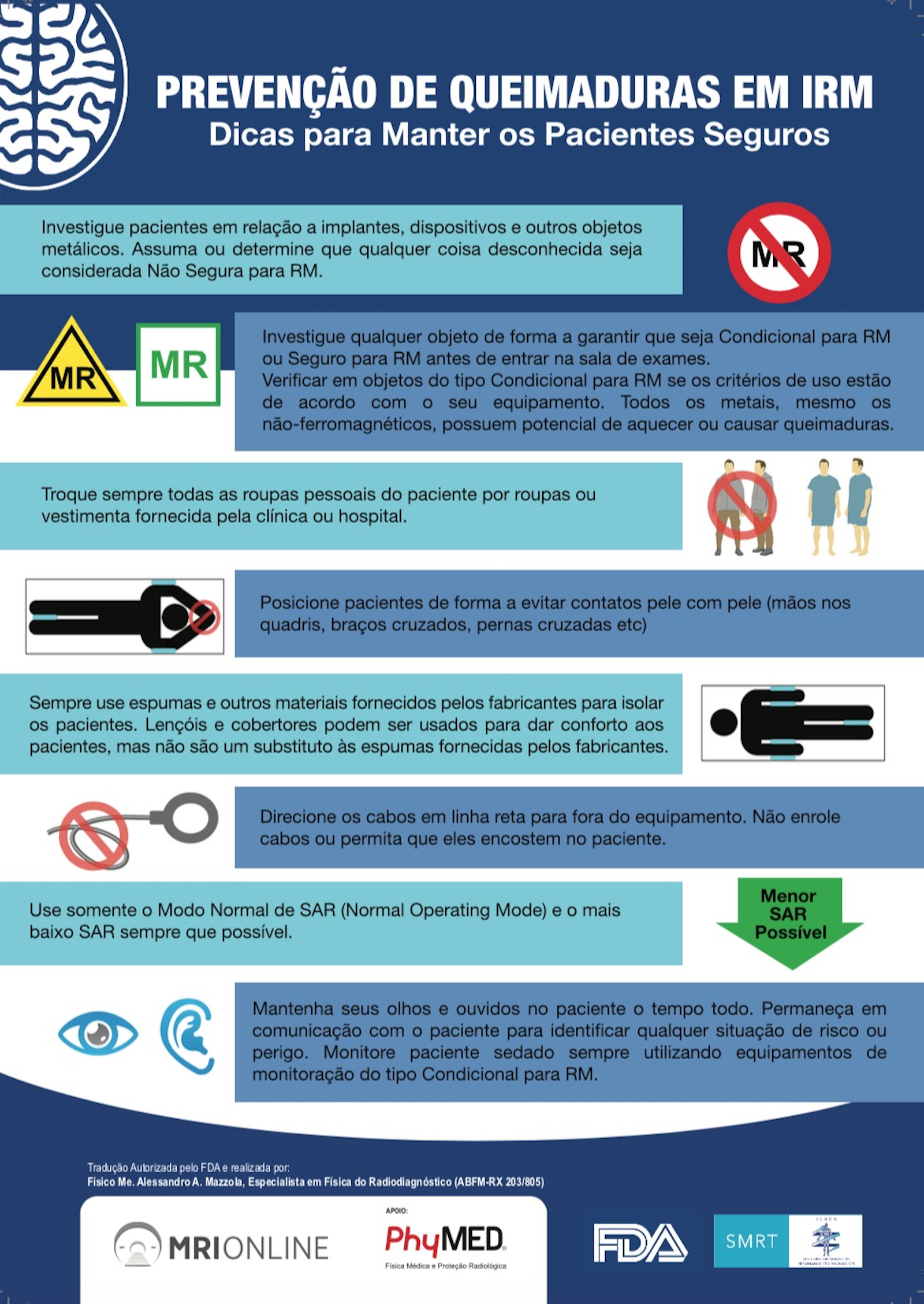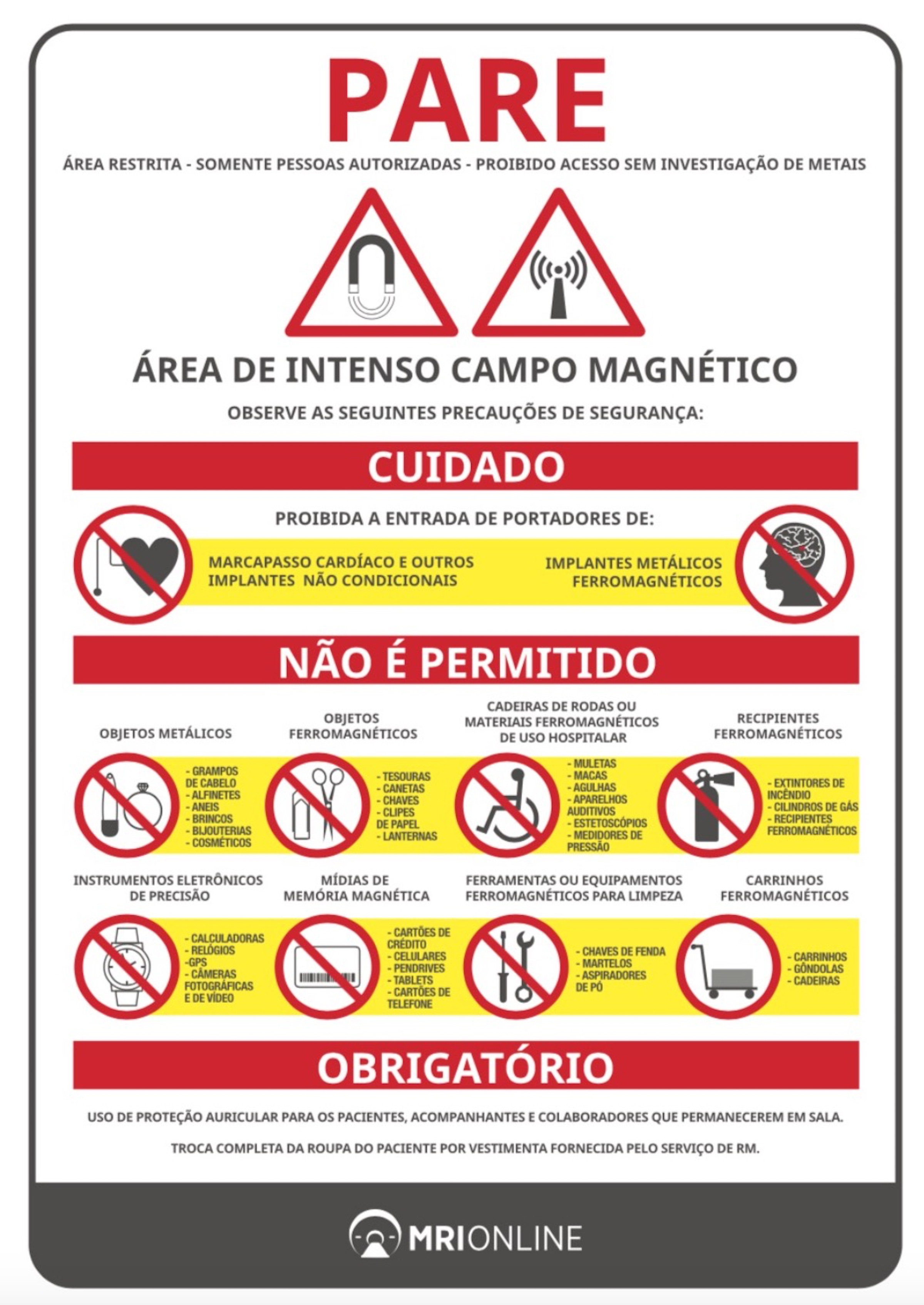 Apesar de o processo de obtenção de imagens por ressonância magnética (RM) não utilizar radiação ionizante e o método ser considerado seguro, existem muitos riscos associados à realização dos exames e ao ambiente de RM que já ocasionaram acidentes graves associados à morte de pacientes, indivíduos em geral e trabalhadores. Cabe destacar que o Brasil não tem legislação ou mesmo recomendação sobre aspectos de segurança em RM e é, portanto, dever das instituições e dos que trabalham garantir a segurança dos pacientes, acompanhantes, colaboradores e prestadores de serviço na sua relação com o ambiente de RM. Dessa forma, buscamos fornecer um conjunto de orientações práticas para a rotina de serviços clínicos ou de pesquisa em imagem por RM, de forma que se torne parte das políticas de segurança das instituições.